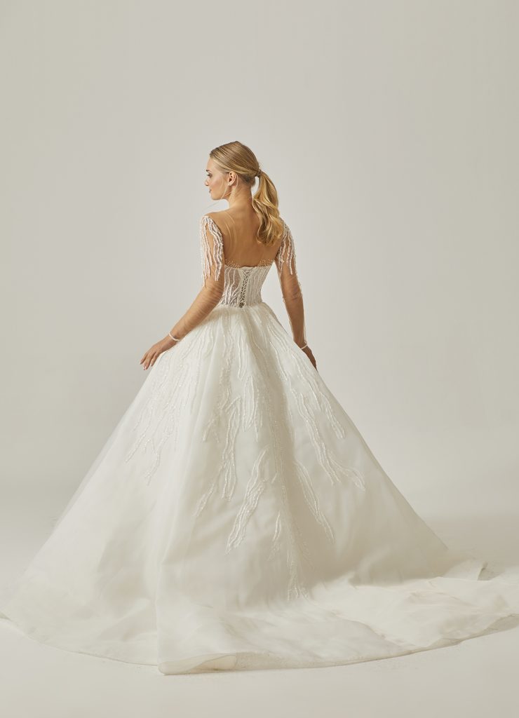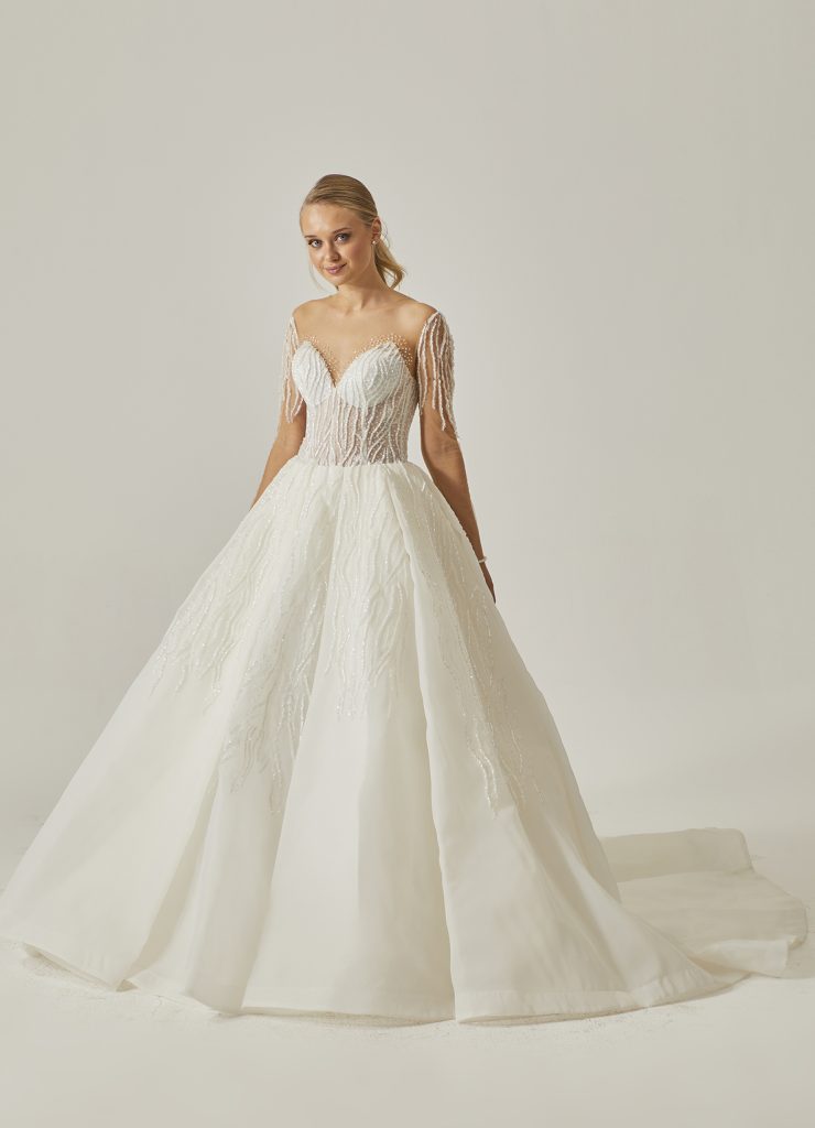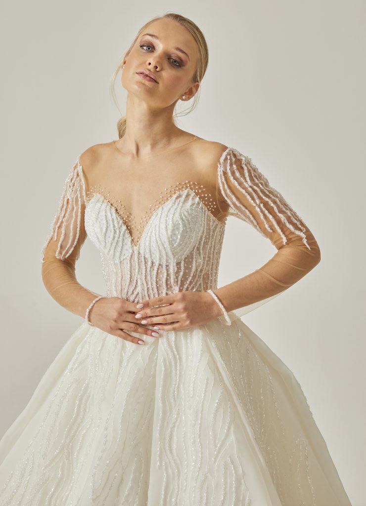 Bu gelinlik, ışıltıdan beslenen, kendine gösterişli bir dünya kuran kadınlar için.